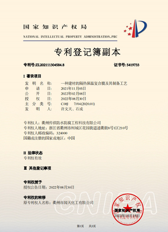 衢州傳祺新材料科技有限公司是衢州市聞天化工有限公司的下屬企業(yè);衢州市聞天化工有限公司成立于2003年,是國內(nèi)最早研發(fā)、生產(chǎn)氟碳涂料的企業(yè)之一。衢州傳祺新材料科技有限公司成立于2017年,公司專注于高分子氟材料的開發(fā)和含氟材料在防腐、防水領(lǐng)域的應(yīng)用。經(jīng)過6年的不懈努力,已獲得了化工和建筑領(lǐng)域六項國家發(fā)明專利授權(quán)和兩項新產(chǎn)品科技成果獎,參與了中國建筑材料流通協(xié)會《房屋修繕防水工程規(guī)范》標(biāo)準(zhǔn)的編制工作,中建協(xié)涂裝委員會浙西工作站設(shè)立在我公司。